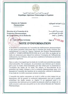 Les autorités appellent l’ensemble des acteurs concernés à respecter strictement ces nouvelles dispositions, afin de garantir la conformité réglementaire et d’assurer un haut niveau de qualité scientifique dans les essais pharmaceutiques menées en Algérie.